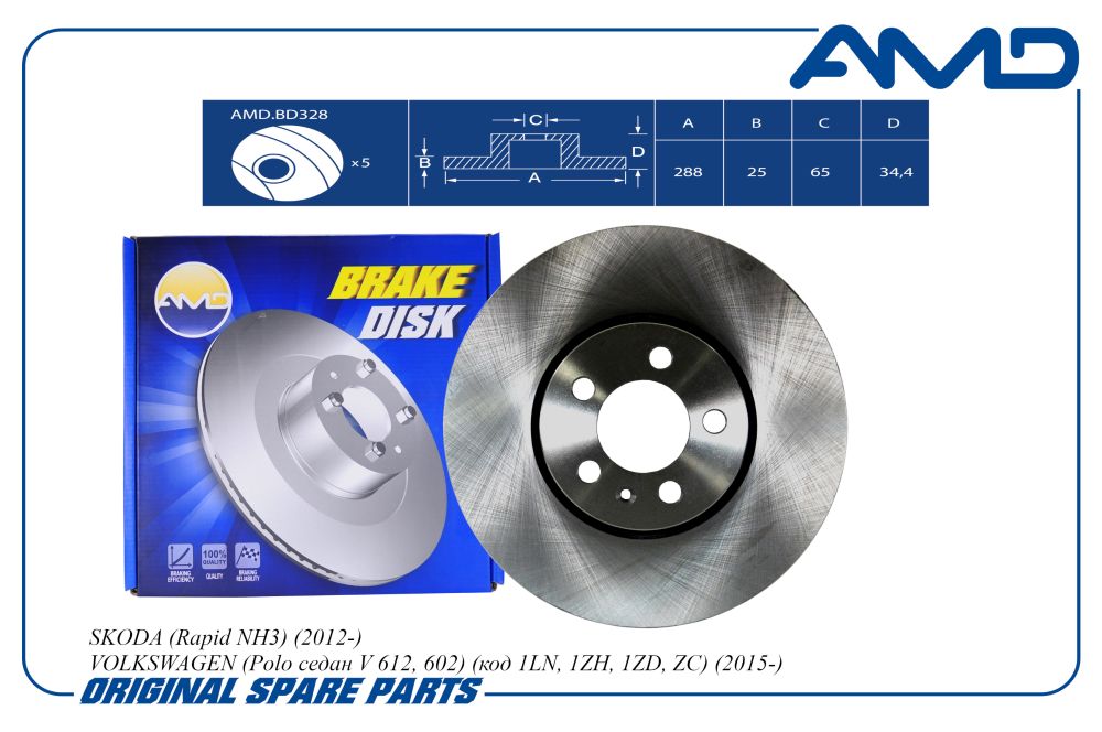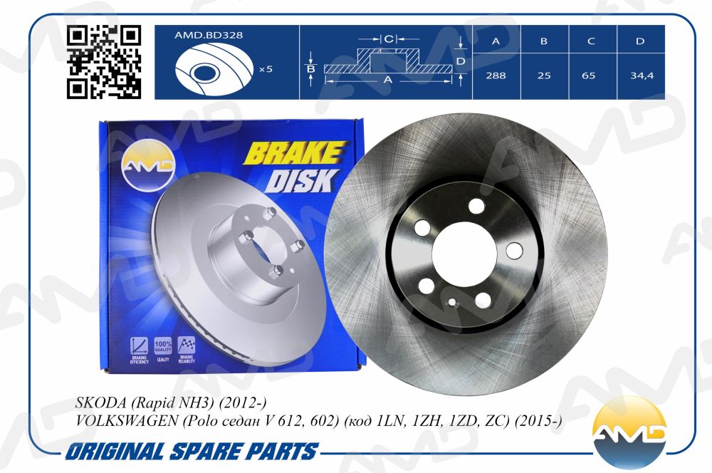 Диск тормозной передний (288 мм) SKODA Rapid NH3, 2012-, VOLKSWAGEN Polo седан V 612, 602, код 1LN, 1ZH, 1ZD, ZC, 2015-, 288 мм AMDBD328 amdbd328