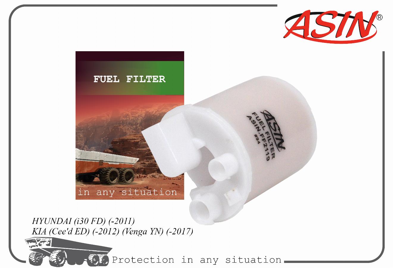 Фильтр топливный Kia Ceed 1.4-2.0 06->/Venga 1.4/1.6 06>/Hyundai Veloster/i40 CW 1.6/2.0 11>/i10/i20/i30/ix20 1.1-1.6 07> ASIN asinff2119