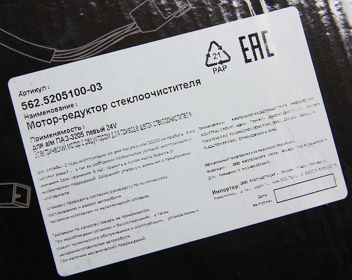 Мотор-редуктор стеклоочистителя ПАЗ-3205 левый 24V MEGAPOWER Megapower 562520510003